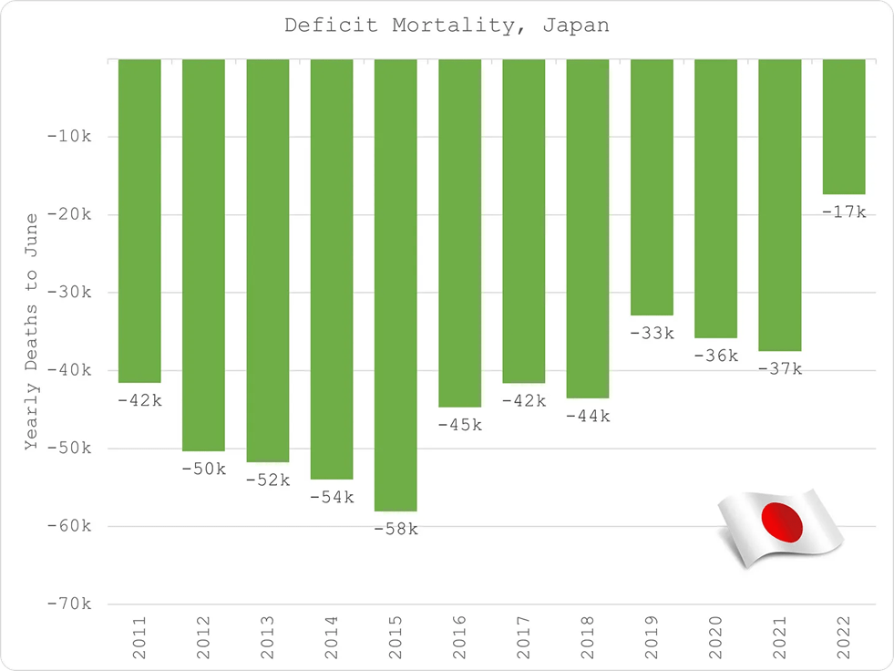 “Portanto, após um ano de mortalidade abaixo do normal, medido em termos de excesso sazonal e linha de base durante a suposta epidemia, o Japão agora está experimentando os piores resultados de mortalidade nos últimos tempos”.